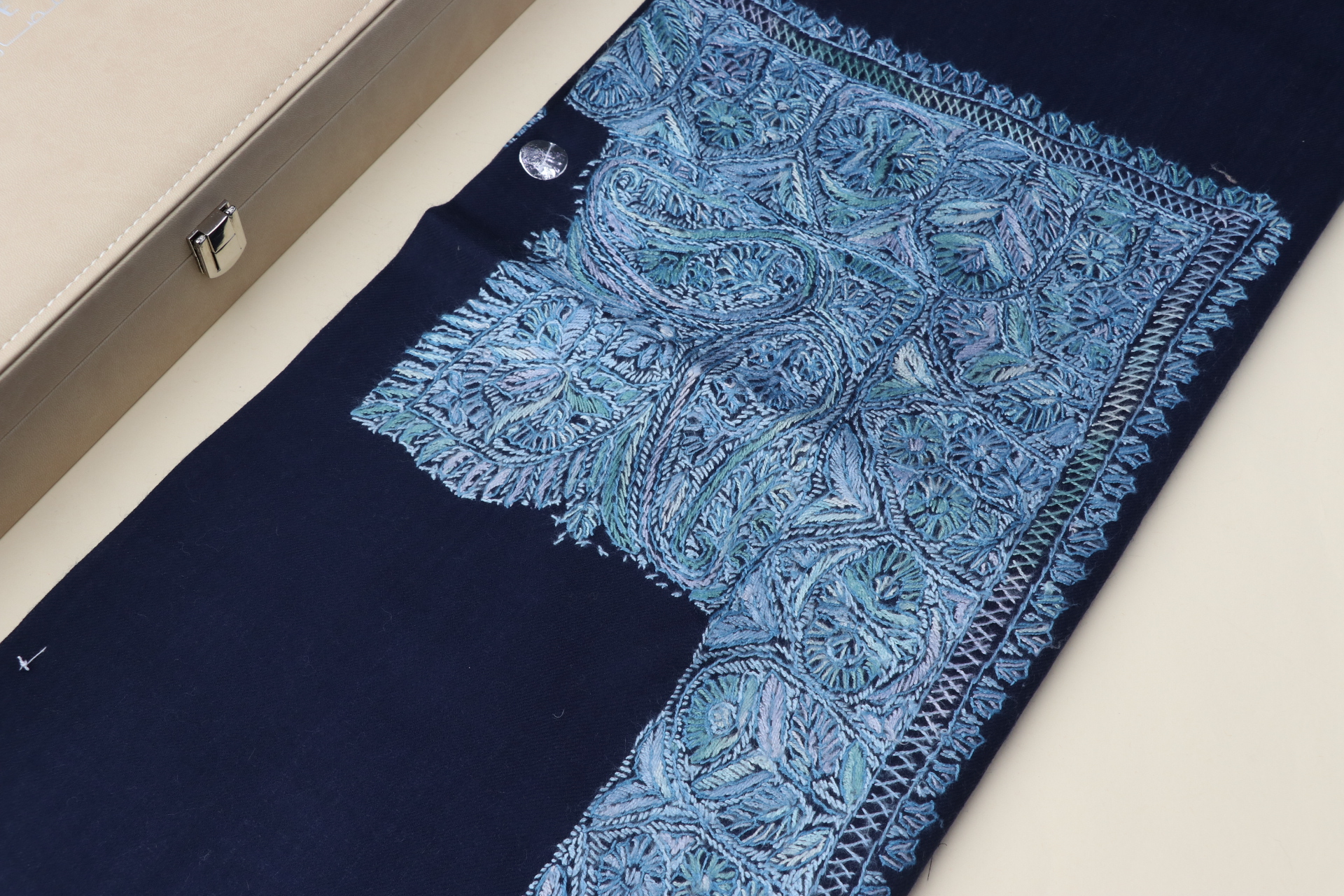 - الألوان: خلفية داكنة مع تطريز بدرجات الأزرق الهادئ