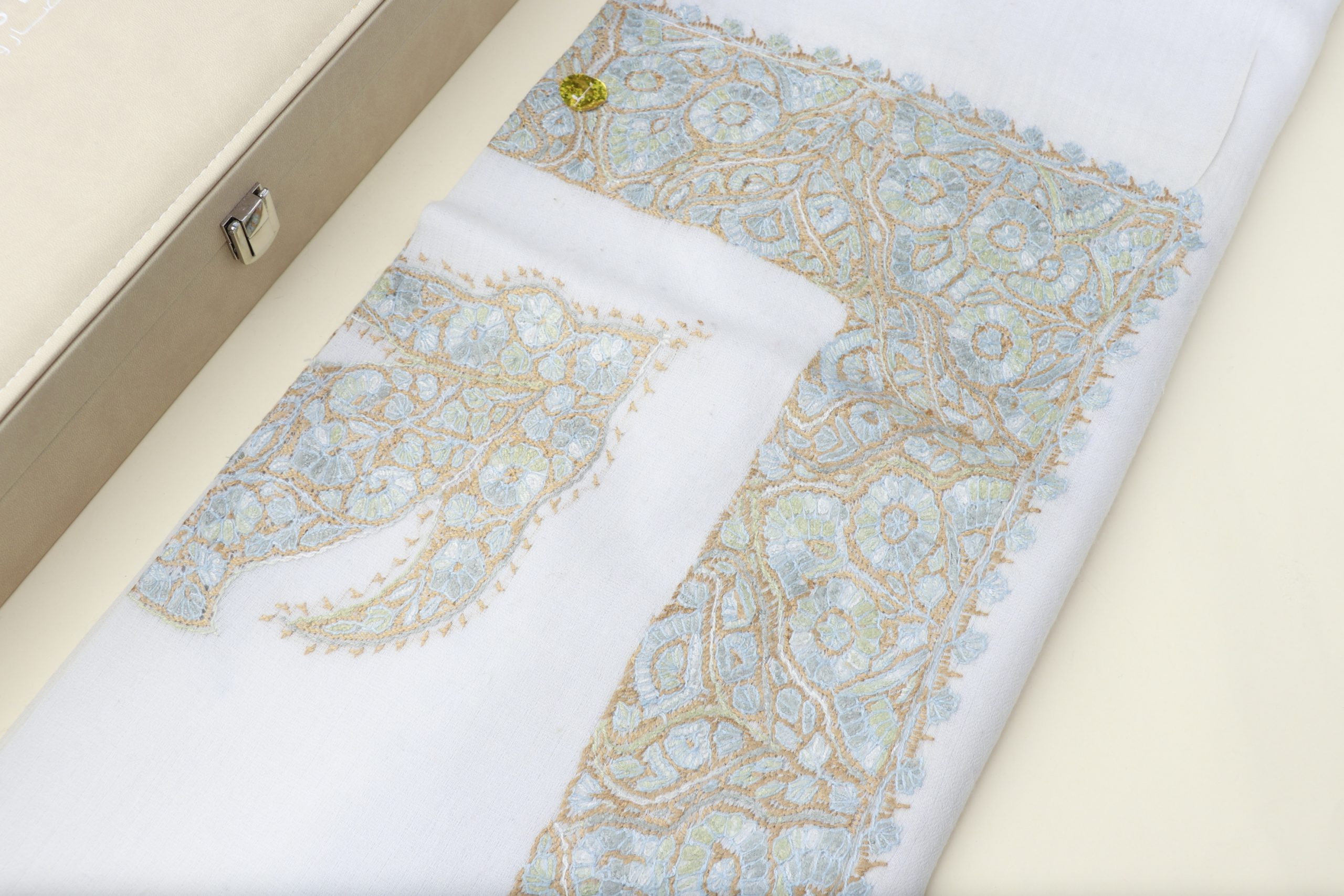 - الألوان: أبيض مع تطريز بالألوان الأزرق الفاتح ،البيج المائل للذهبي والأبيض الكريمي.