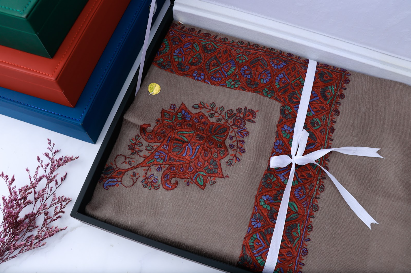 - صندوق جلدي أنيق: يأتي مع صندوق جلدي فاخر لحفظ الشال بشكل ممتاز.