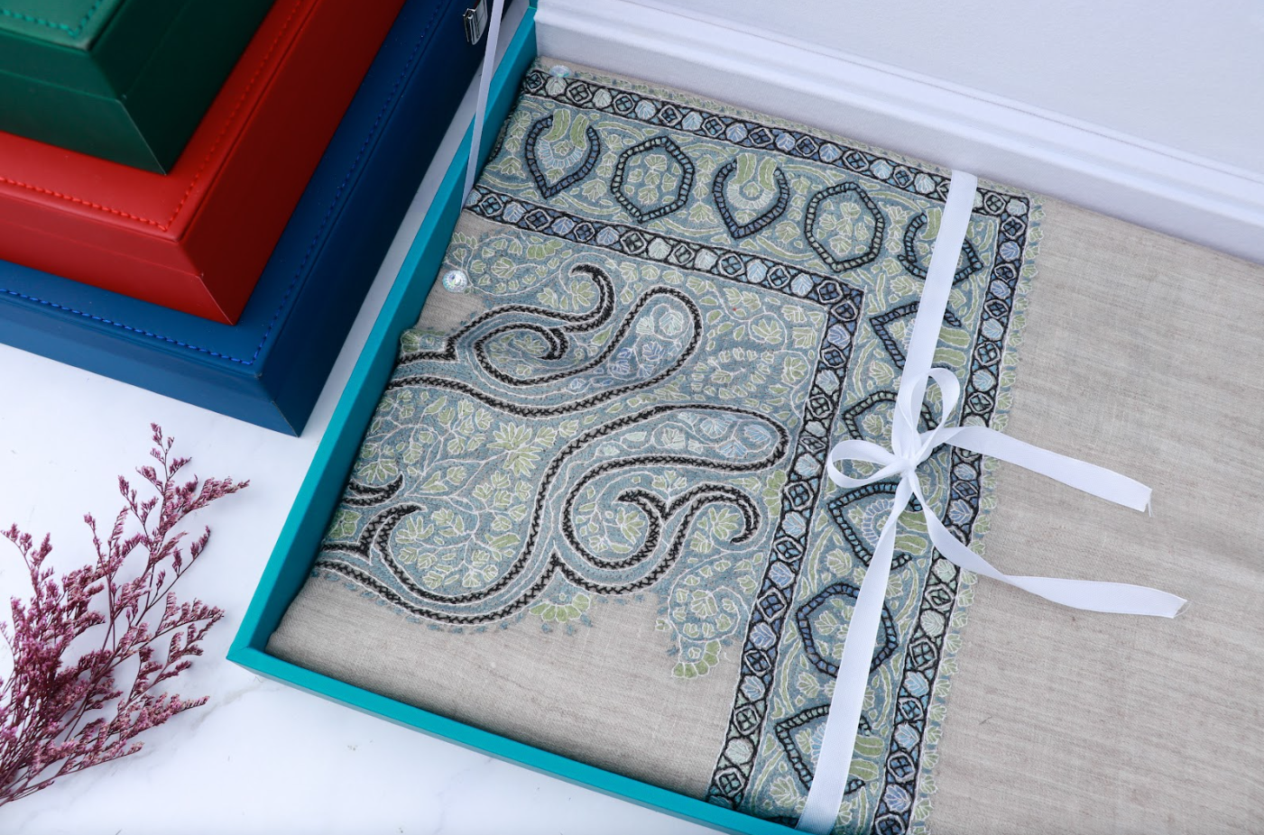 - صندوق جلدي أنيق: يأتي مع صندوق جلدي فاخر لحفظ الشال بشكل ممتاز.