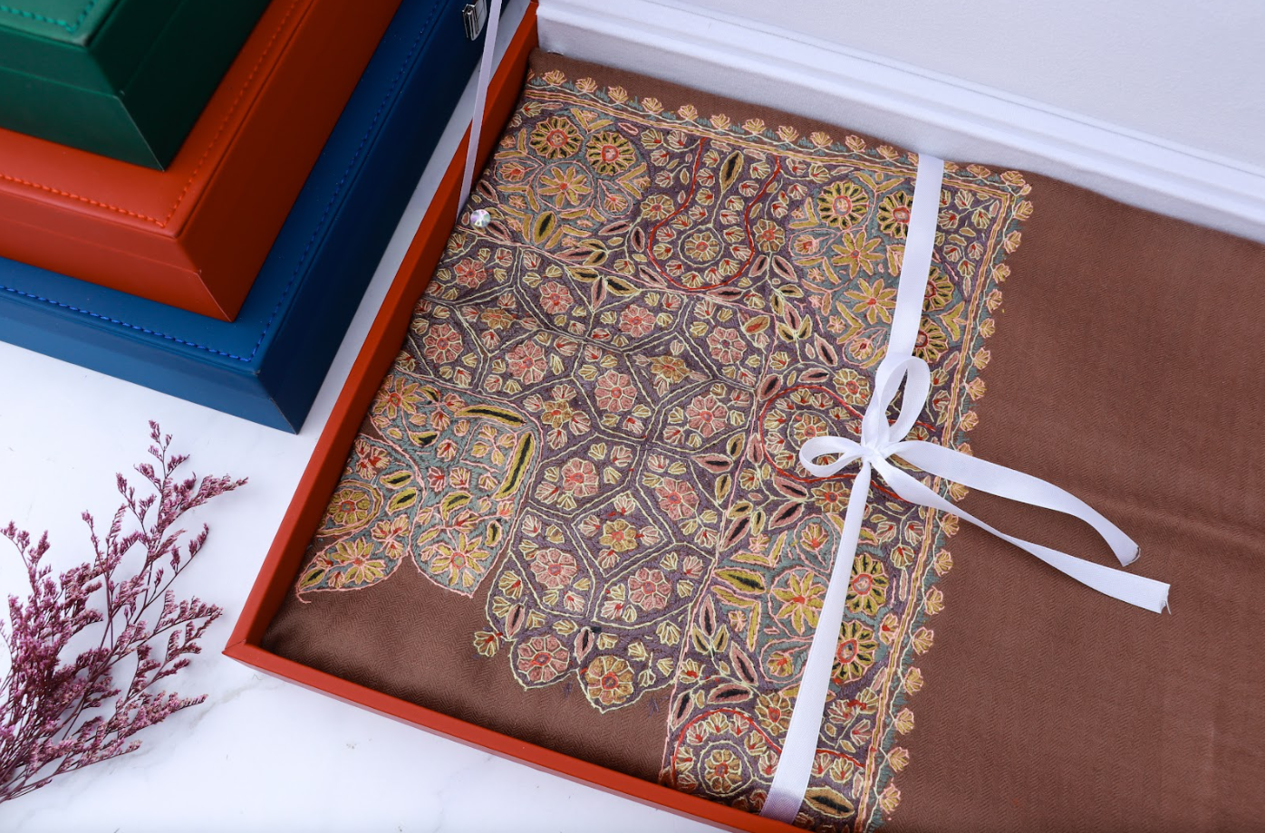 - صندوق جلدي أنيق: يأتي مع صندوق جلد فاخر للحفاظ على الشال بشكل ممتاز.
