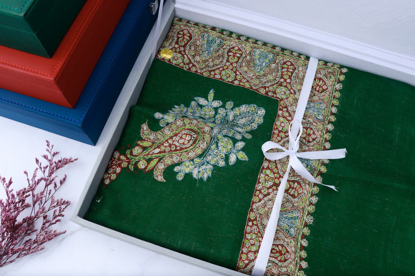• صندوق جلدي أنيق: يأتي مع صندوق جلدي فاخر لحفظ الشال بشكل ممتاز.