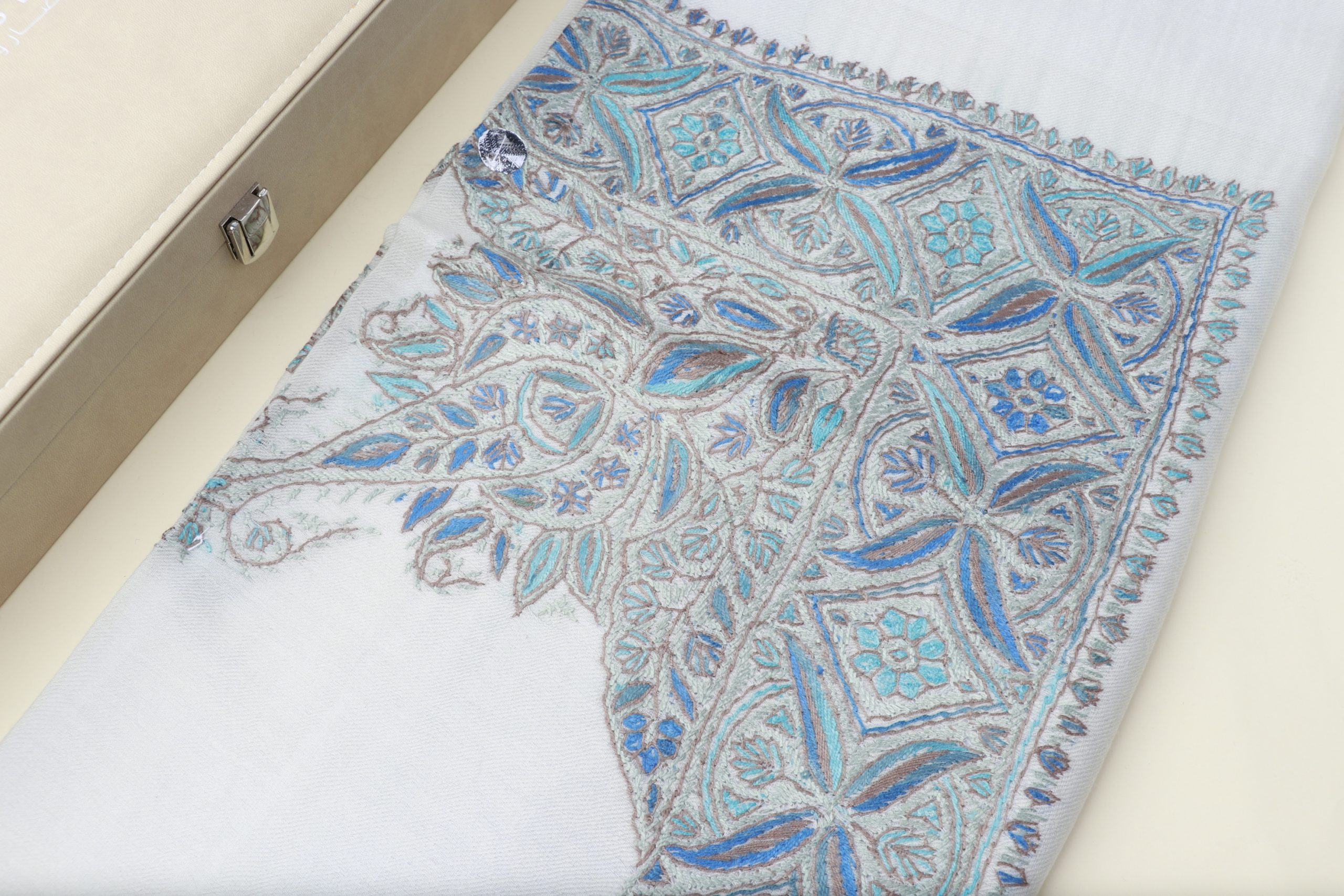 - الألوان: أبيض مع تطريز بدرجات الأزرق (سماوي، فيروزي، أزرق ملكي) ولمسات رمادي فاتح